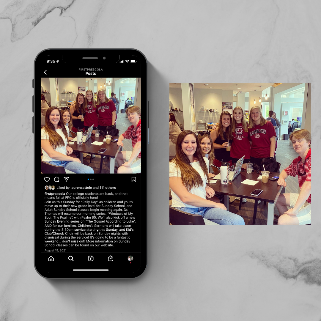 As the First Presbyterian Church College Ministry prepared to kickoff their Fall Semester, a social media post was used to promote their ministry both among church members and prospective students. The post also included churchwide information regarding Sunday School classes and sermons series.